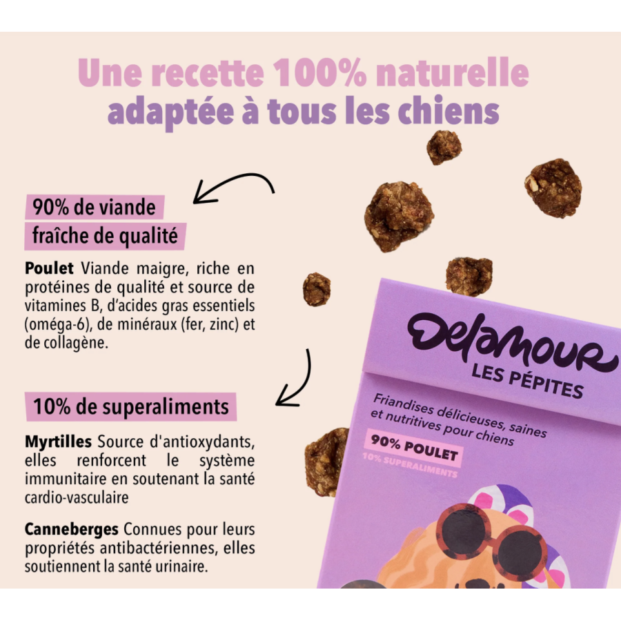 Constituées à 90% de viande fraîche pour un apport riche en protéines, les Pépites sont issues d'un procédé de fabrication air-dried innovant, permettant de préserver les nutriments et la saveur des ingrédients en garantissant une manipulation propre, sans miettes ni odeurs.